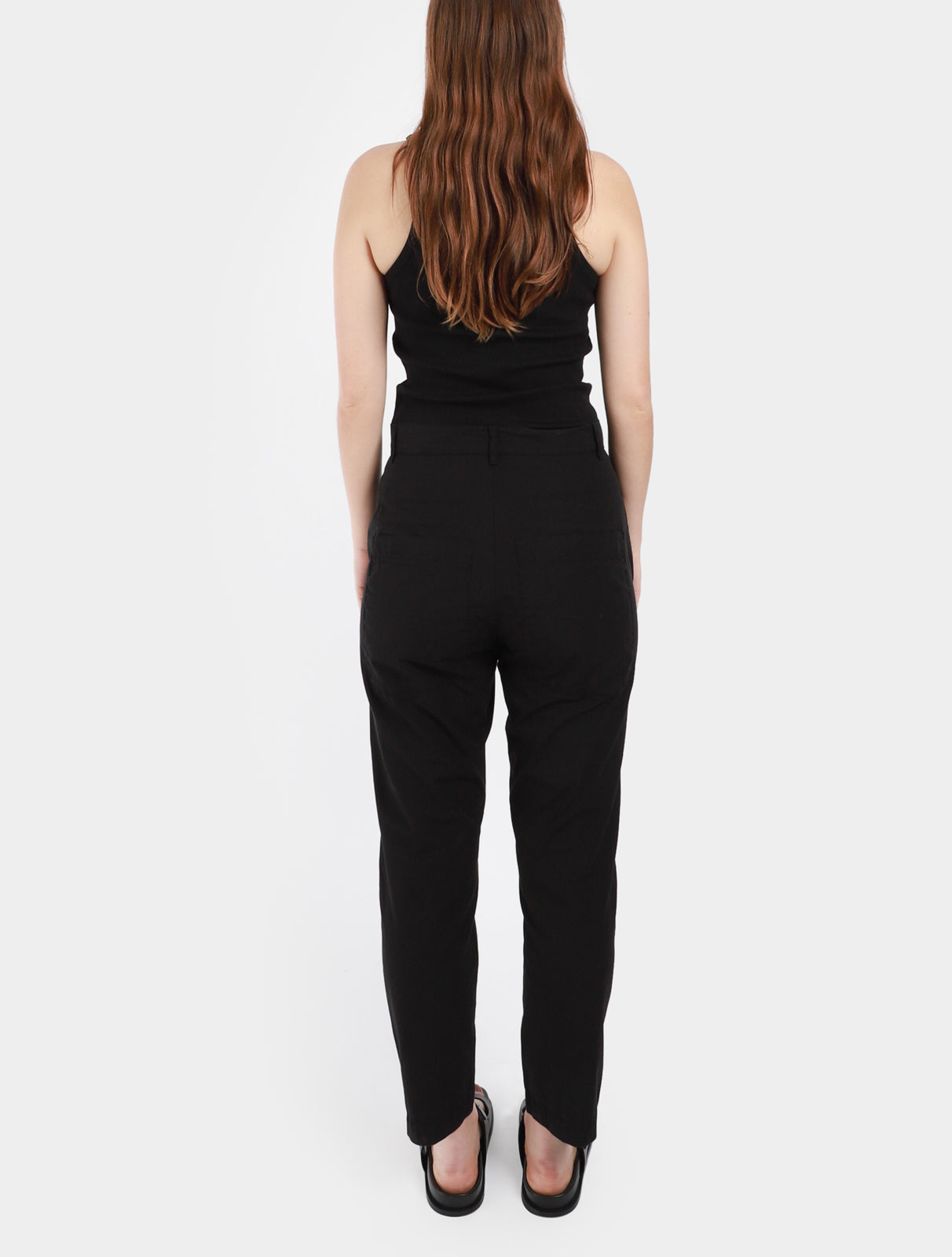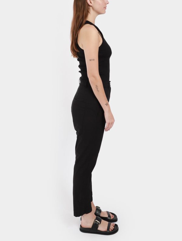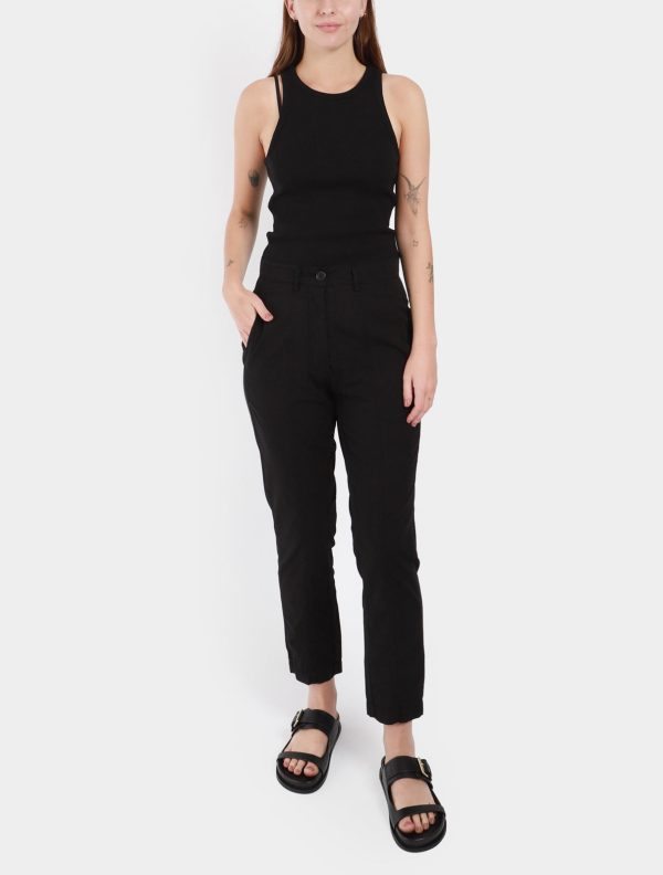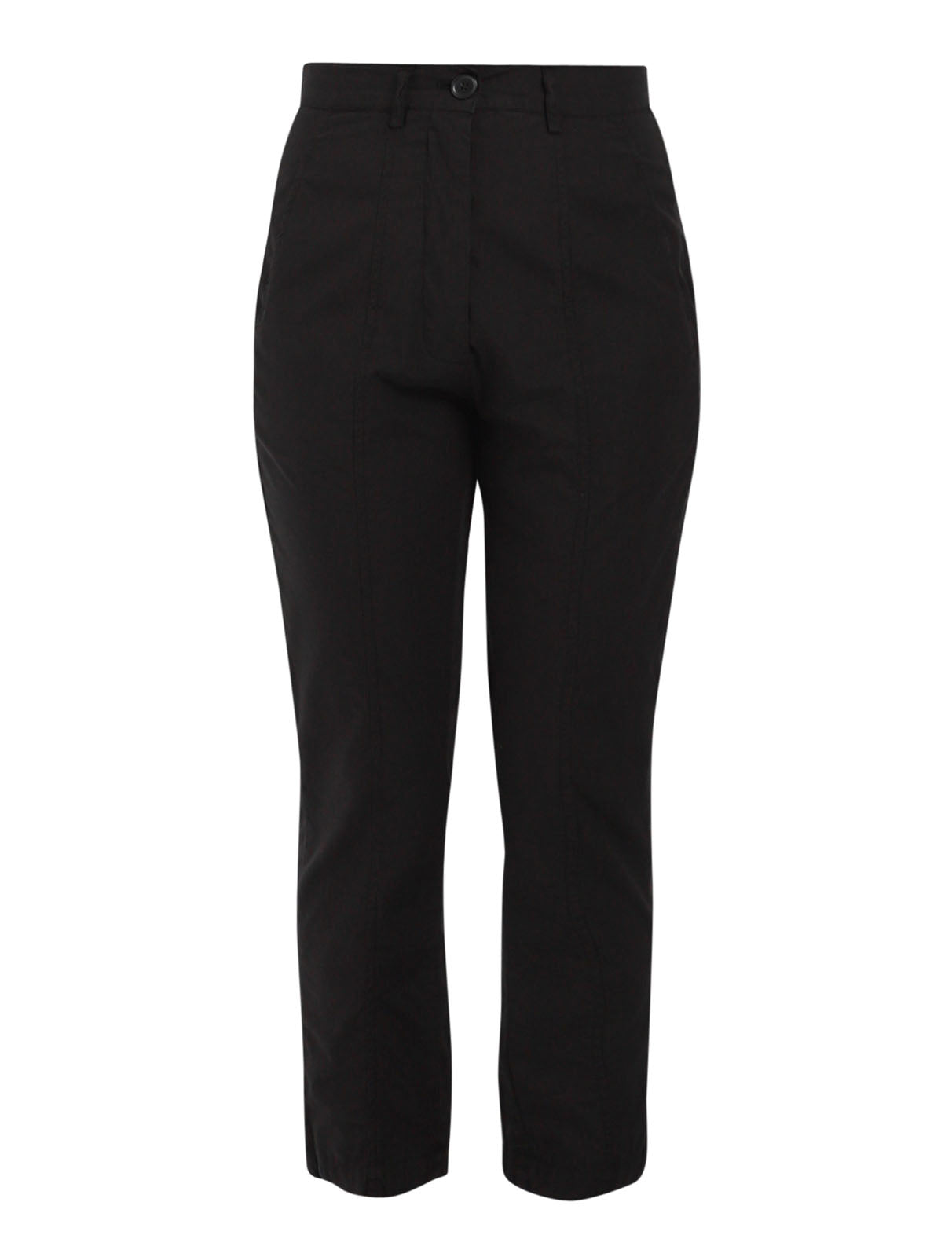 Slim Trousers Slim Trousers from Munivino. Waistline Buttons at front to close Belt loops Slim fit Side and back pockets Cropped Colour: Black 100% Cotton Made in Portugal Model is size XS and wears size XS